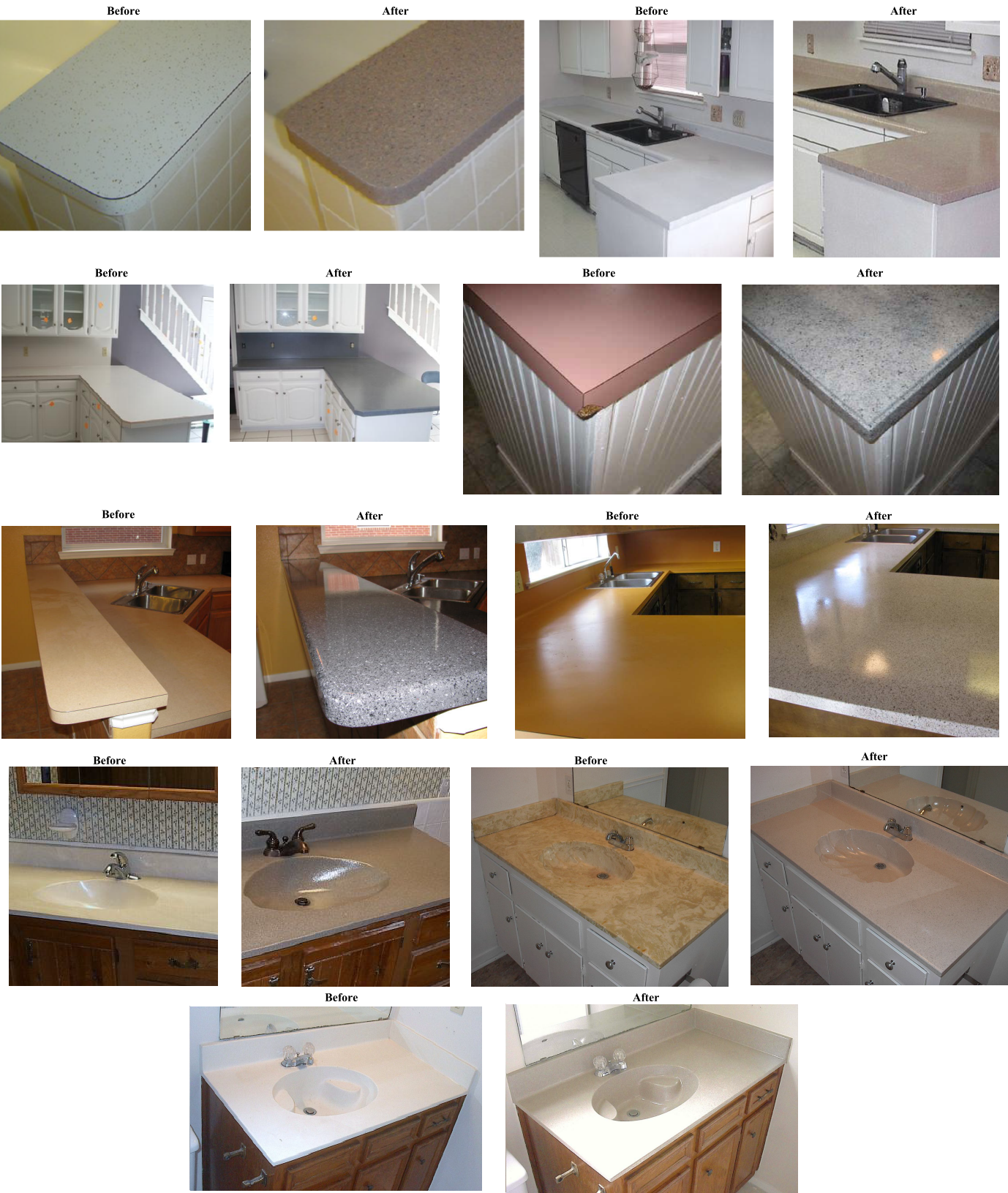 Tired of looking at the same old countertops for years? Give your kitchen, a facelift and save up to 80% off the cost of replacement in just a few days instead of many weeks. Also avoid all of the mess and hassle that comes with it. Stained or dated formica, laminate, corian, tile and cultured marble countertops can be restored to brand new, in your color, affordably and without replacement. If the counters are damaged, they can be repaired before they are resurfaced. The countertop refinishing process applies a long lasting, hard and beautiful coat over the existing surface for a fraction of replacement costs. Kitchen countertop refinishing covers over unsightly seams, burn marks, nicks and scratches, leaving a smooth, easy to clean surface that will add beauty and convenience to your home for many years. Every year more people are discovering the benefits of kitchen countertop reglazing. We also do vanity countertop resurfacing and bathtub refinishing.